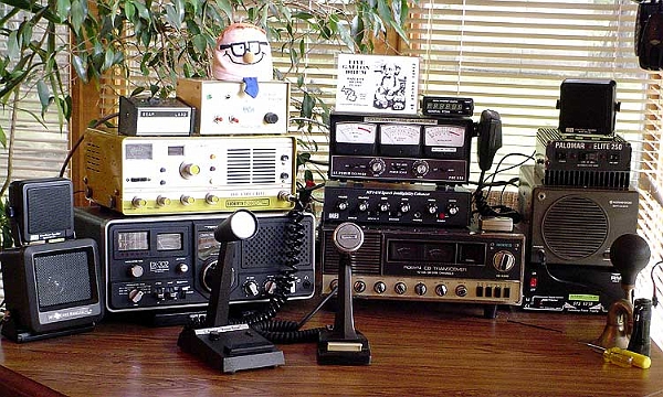 Another view of the same bench. Left to right, a Yaesu FRG7 (bottom), a Robyn 240D Executive (AM 40, PLL, tube), and a Robyn 520D in the middle. |